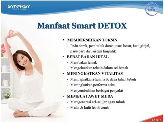 Saya mengambil contoh produk Suplemen dari PT Synergy karena saya tahu betul kualitas Paket Smart Detox dari Synergy, manfaat dan kelebihannya untuk menurunkan berat badan, membakar lemak dan untuk kesehatan lainnya. Jutaan orang di dunia sudah membuktikan manfaat dan hasil dari program diet. Yang menyenangkan, semua produk suplemen dari Synergy tidak mengandung unsur bahan kimia, jadi semua benar-benar herbal, dan yang lebih hebat Synergy ini sudah ada di 29 negara di dunia.